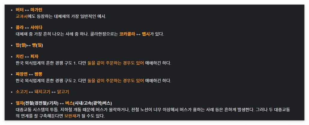 대체재와 보완재의 예시가 잘 나와있어서 나무위키에서 가져와봤다.